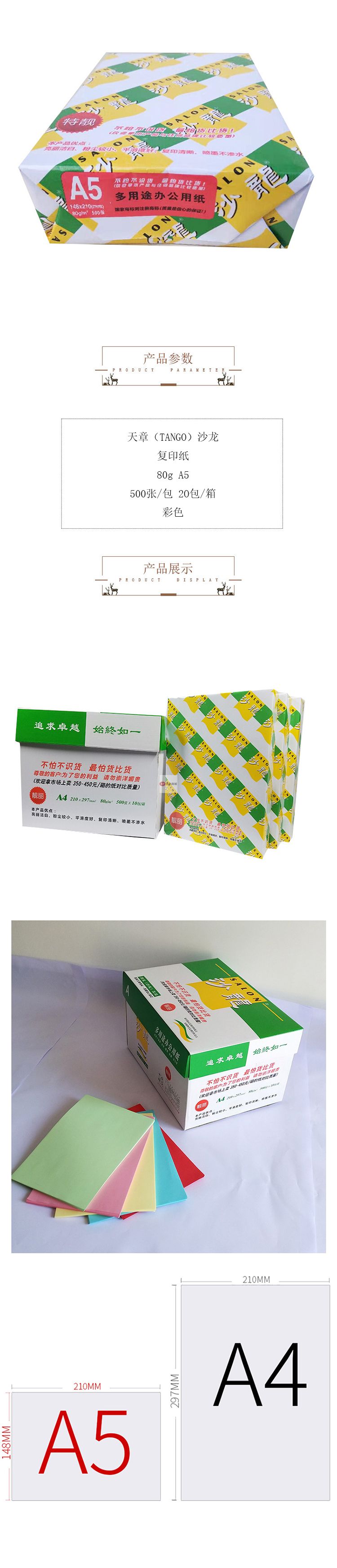 商品名稱:天章(TANGO)沙龍復(fù)印紙 80g A5 500張/包 20包/箱 綠色