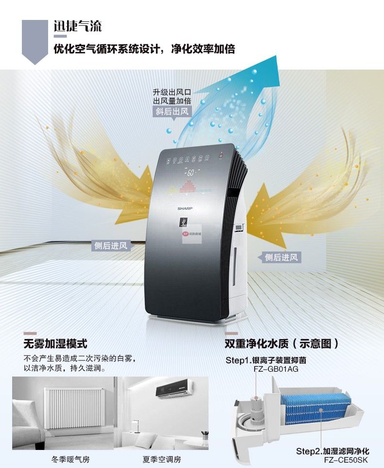 自營(yíng)夏普KC-CG60-M 空氣凈化器 除甲醛PM2.5霧霾異味花粉加濕智能互聯(lián)辦公室除煙塵