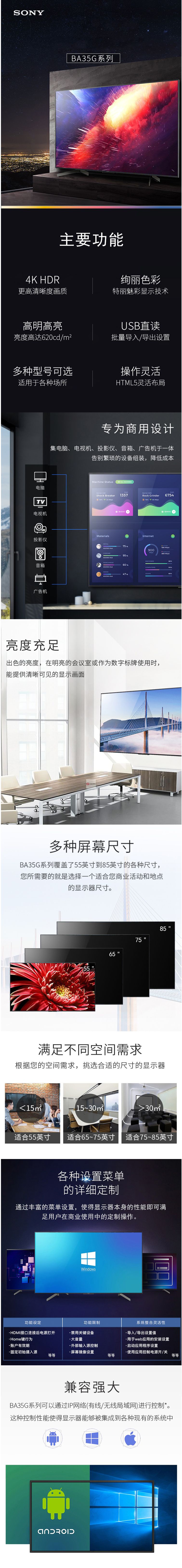 商品名稱:索尼(SONY) FW-65BA35G 65英寸 專業(yè)商用電視機 4K超高清 HDR 智能網(wǎng)絡數(shù)字標牌 辦公視頻會議顯示器
