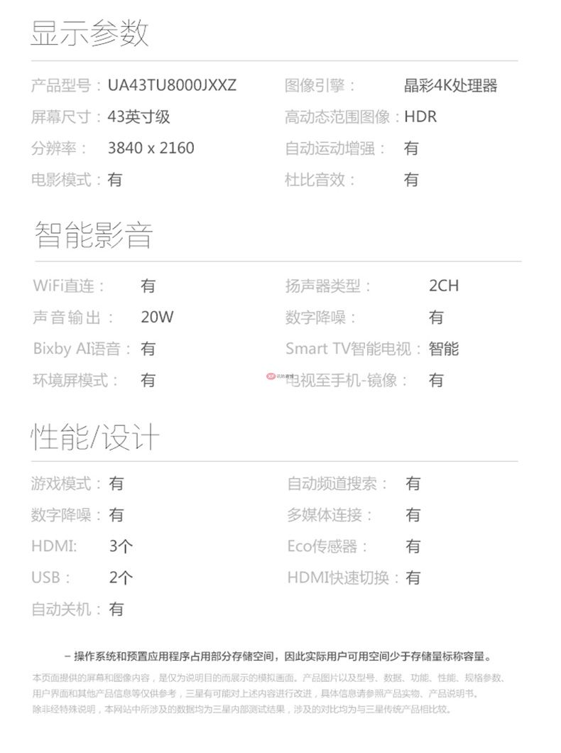 商品名稱:三星(SAMSUNG) UA43TU8000JXXZ 43英寸 TU8000 4K超高清 全面屏 HDR畫質(zhì)增強 教育資源智能液晶電視機