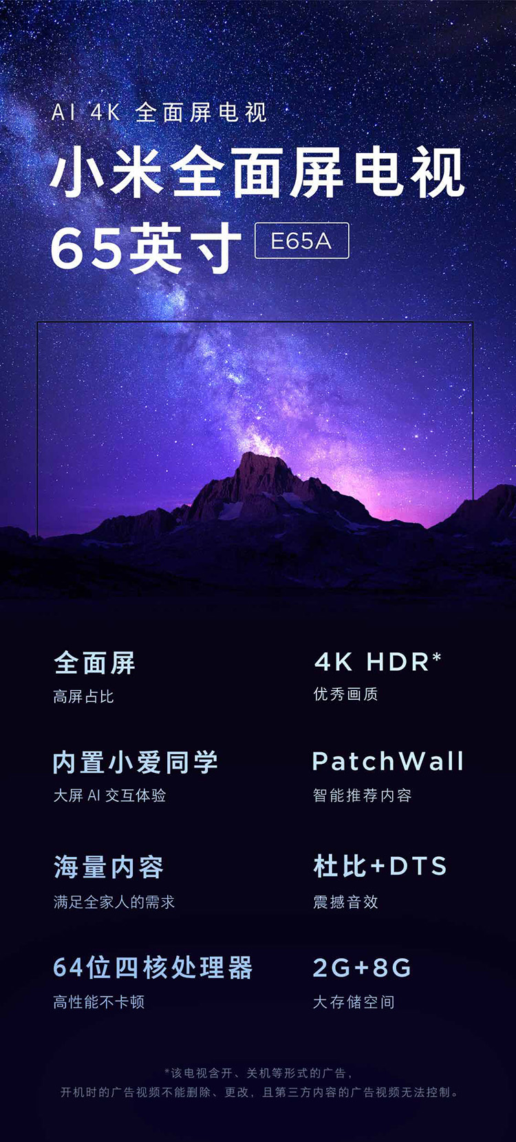 自營小米(MI) L65M5-EA 全面屏電視E65A 65英寸 4K超高清 HDR 內(nèi)置小愛 藍牙語音 2GB 8GB AI人工智能網(wǎng)絡(luò)液晶平板電視L65M5-EA (65英寸 小米電視E65A)