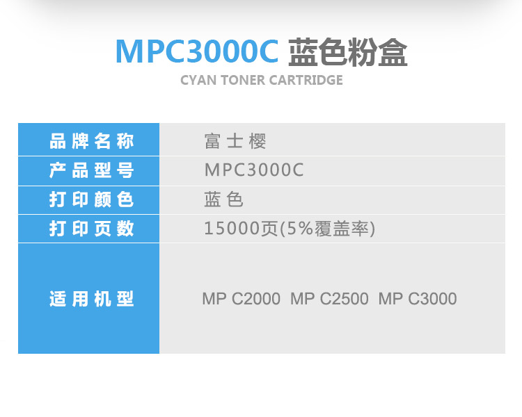 商品名稱:富士櫻(FUSICA)MPC3000C青色粉盒 適用理光MP C2000 C2500 C3000