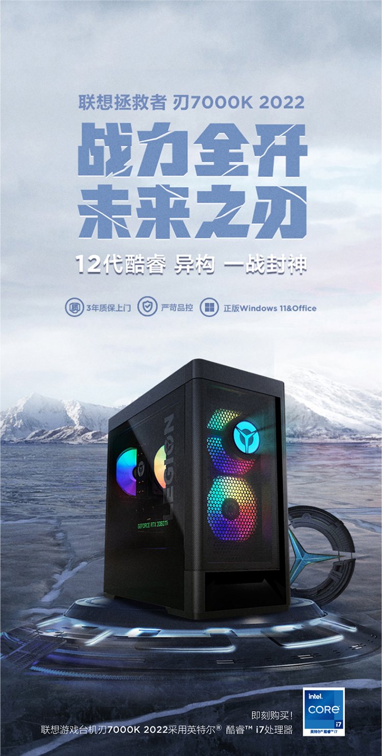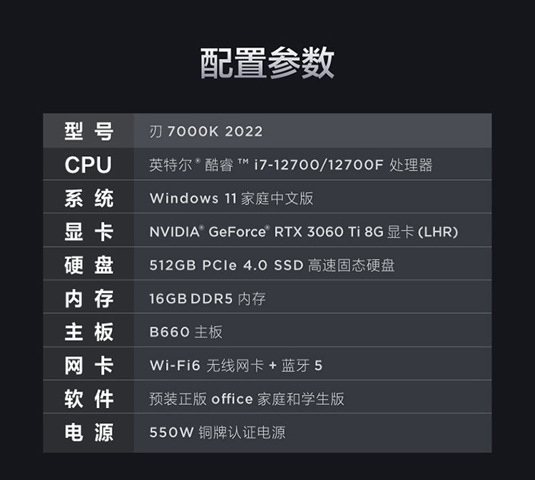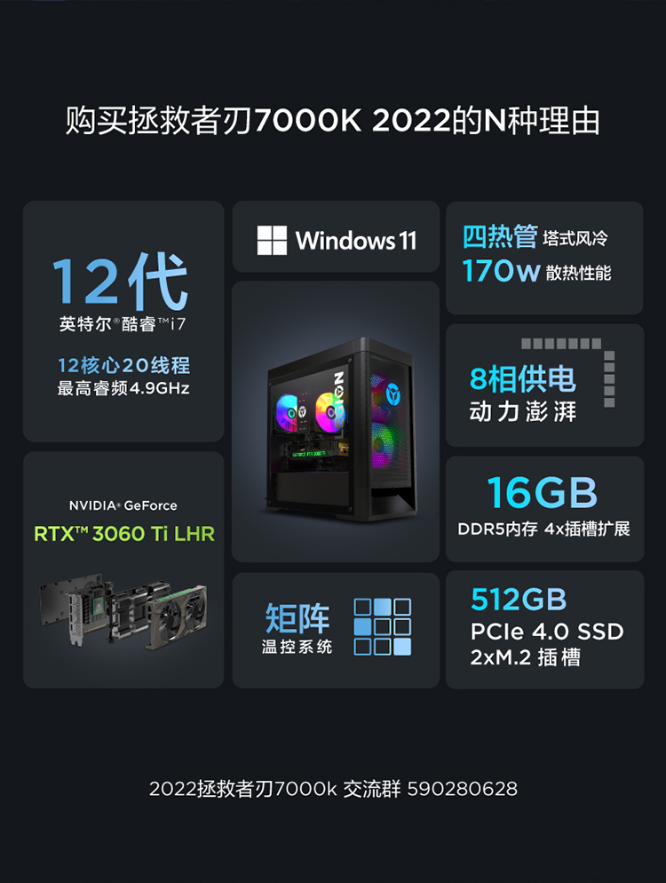 商品名稱:?聯(lián)想(Lenovo)拯救者刃7000K 2022游戲電腦主機(jī)(12代i7-12700F RTX3060Ti LHR顯卡 16G DDR5 512G SSD)