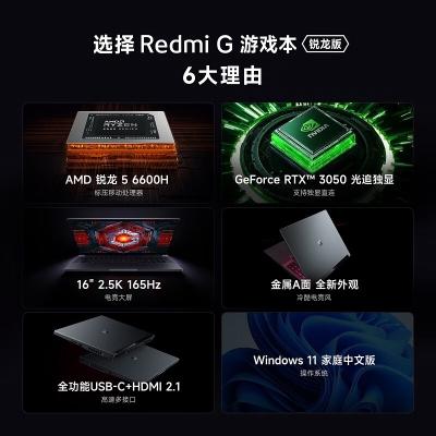 商品名稱:小米 Redmi G 游戲本 筆記本電腦(R5-6600H 16G 512G RTX3050 2.5K 165hz高刷屏 高色域電競(jìng)屏)