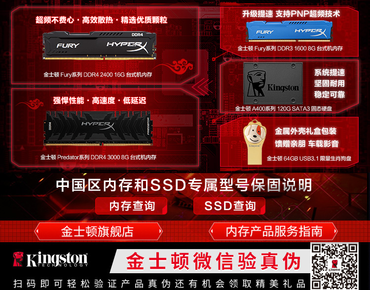 • 商品名稱:金士頓(Kingston)駭客神條 Fury系列 DDR4 2400 16G 臺式機(jī)內(nèi)存