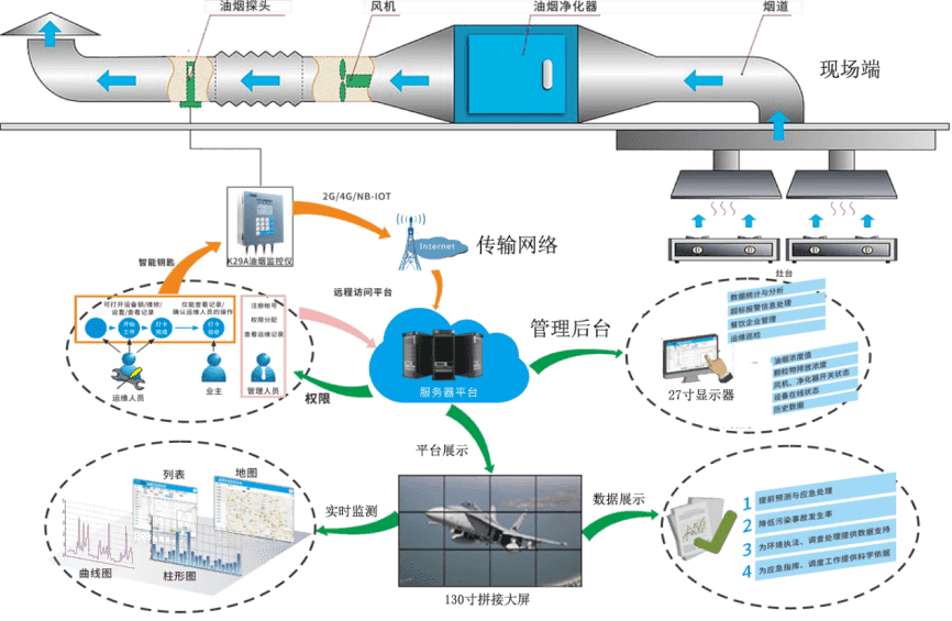 化一環(huán)境“餐飲油煙綜合管治系統(tǒng)”是通過(guò)物聯(lián)網(wǎng)智能感知與無(wú)線通訊技術(shù)、大數(shù)據(jù)分析技術(shù)等,實(shí)現(xiàn)對(duì)餐飲企業(yè)油煙污染物排放的全過(guò)程智能管控。系統(tǒng)實(shí)時(shí)監(jiān)測(cè)油煙排放濃度、顆粒物排放濃度、非甲烷總烴排放濃度及凈化器和風(fēng)機(jī)的工作狀態(tài),通過(guò)“數(shù)據(jù)采集與管理系統(tǒng)、數(shù)據(jù)統(tǒng)計(jì)與查詢系統(tǒng)、餐飲企業(yè)管理系統(tǒng)、報(bào)警管理系統(tǒng)、GIS網(wǎng)絡(luò)地理信息系統(tǒng)、運(yùn)維巡檢系統(tǒng)、決策分析系統(tǒng)”等,實(shí)現(xiàn)不同空間、不同維度圖文一體化的綜合應(yīng)用分析,為餐飲企業(yè)油煙治理設(shè)施的運(yùn)行提供規(guī)范和預(yù)警,為運(yùn)維企業(yè)的管理提供智能化、信息化服務(wù),為監(jiān)管部門(mén)協(xié)同執(zhí)法、決策分析等提供技術(shù)和數(shù)據(jù)支撐。