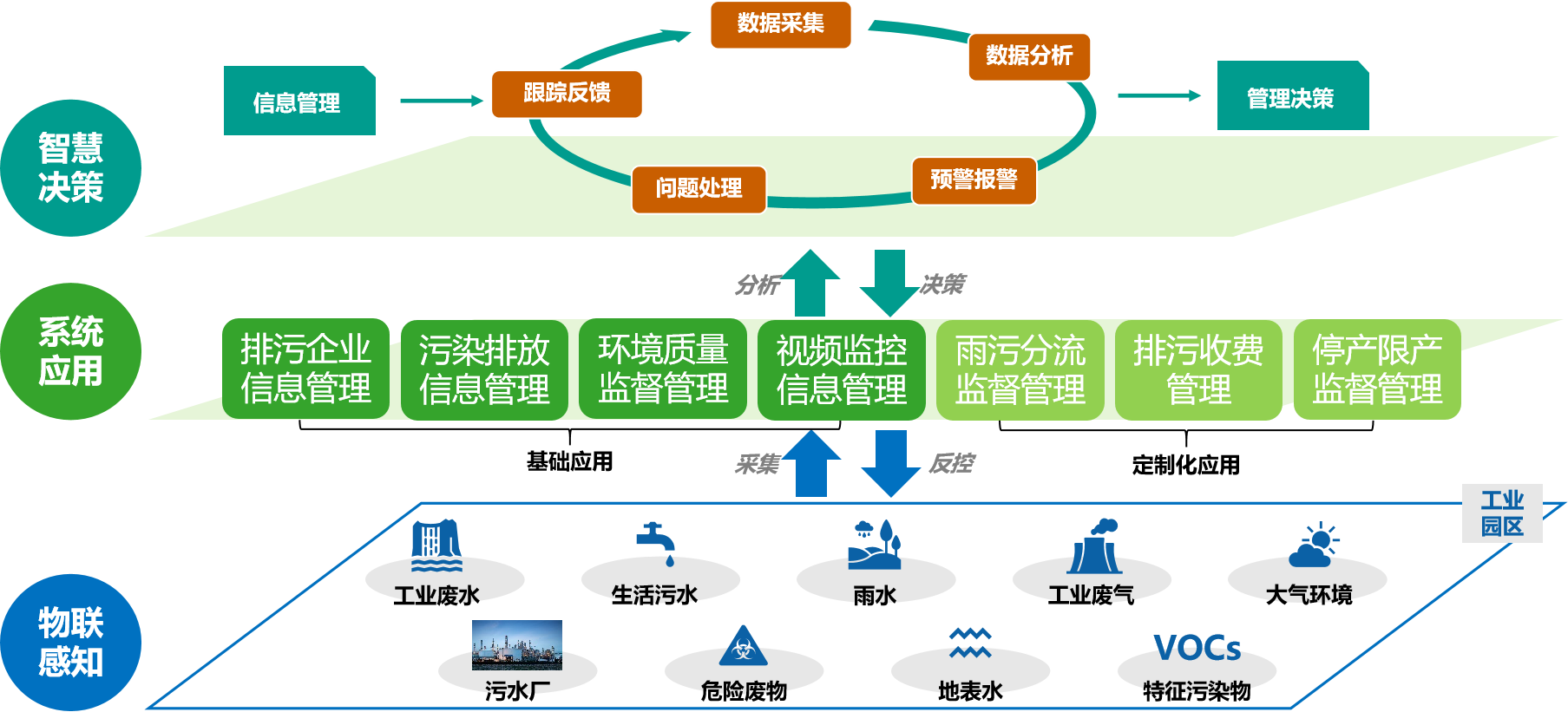 智慧園區(qū)綜合監(jiān)管系統(tǒng)集園區(qū)河涌監(jiān)管、廢水排放監(jiān)管、雨污分流監(jiān)管、園區(qū)大氣管理、廢氣排放監(jiān)管、危廢監(jiān)管等于一體,通過前端在線監(jiān)測(cè)儀表實(shí)時(shí)監(jiān)測(cè)水質(zhì)、大氣和固廢情況,從“安全、環(huán)保、安防、能源”等方面實(shí)現(xiàn)智慧化應(yīng)用,實(shí)時(shí)展示在線監(jiān)測(cè)數(shù)據(jù)、分析、預(yù)警、溯源等,及時(shí)掌控園區(qū)水環(huán)境、大氣環(huán)境、固體廢物的綜合情況,預(yù)警重大污染事故,為園區(qū)日常運(yùn)營和智慧管理提供科學(xué)決策支撐。