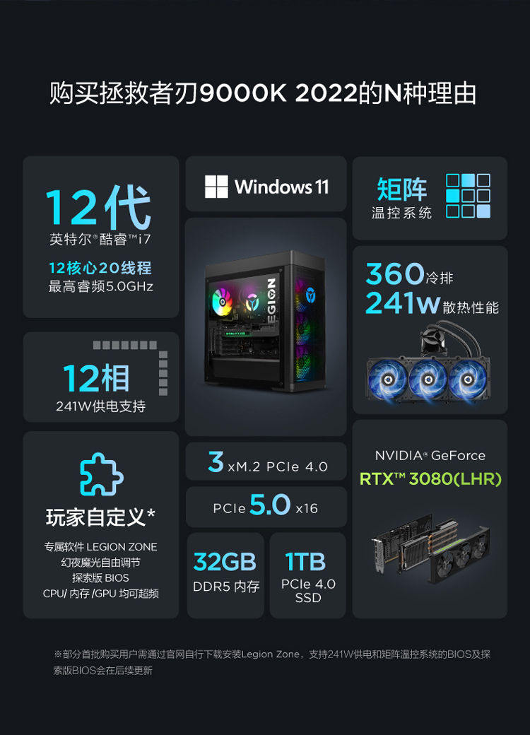 自營(yíng)聯(lián)想(Lenovo)拯救者刃9000K 2022游戲電腦主機(jī)(12代酷睿i7-12700KF RTX3080 10GB LHR顯卡32G DDR5 側(cè)透 )