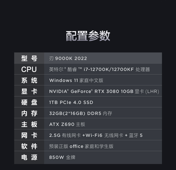 商品名稱:聯(lián)想(Lenovo)拯救者刃9000K 2022游戲電腦主機(jī)(12代酷睿i7-12700KF RTX3080 10GB LHR顯卡32G DDR5 側(cè)透 )