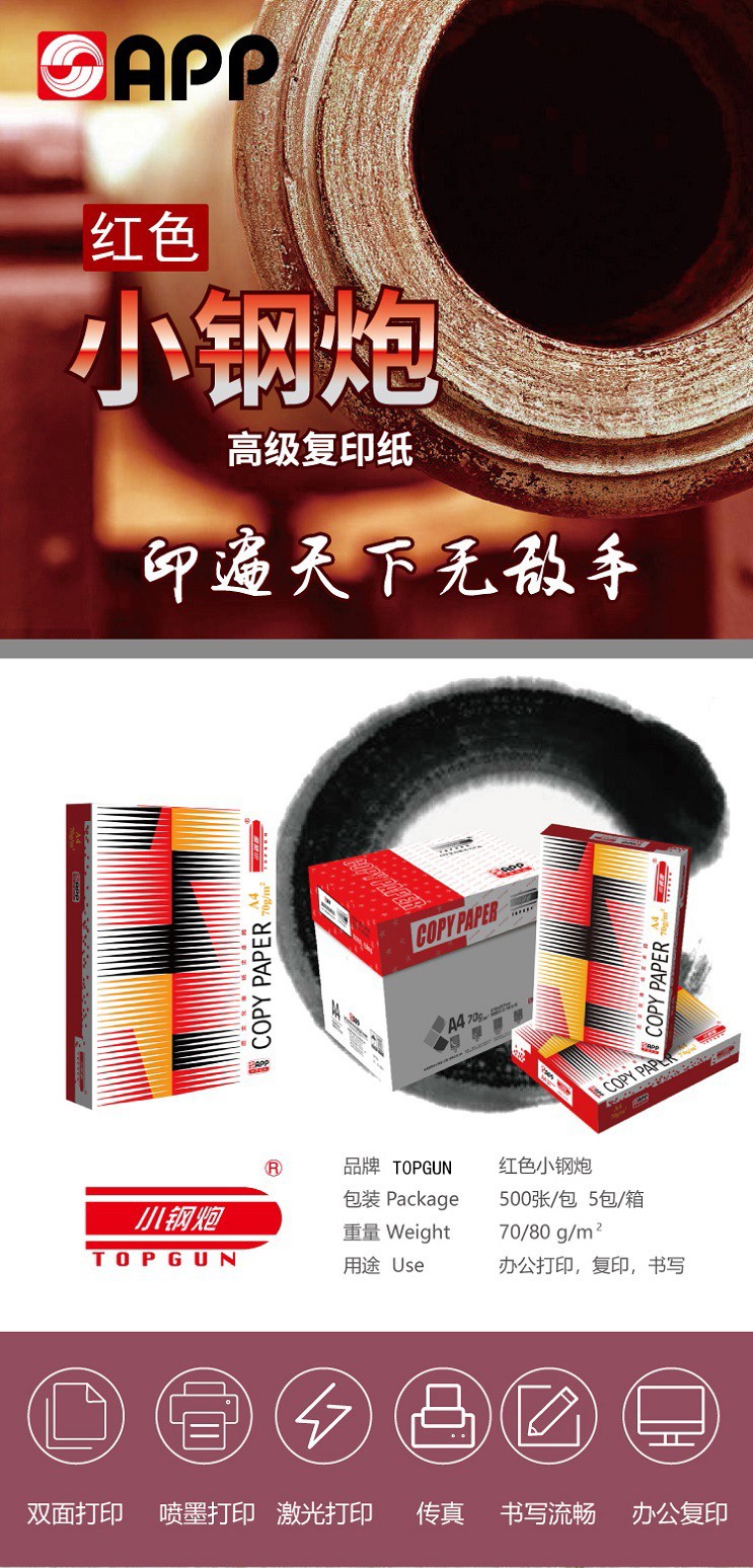 商品名稱:小鋼炮(T0PGUN) 系列三星小鋼炮 復(fù)印紙打印紙辦公用紙A4/80克/5包裝/整箱