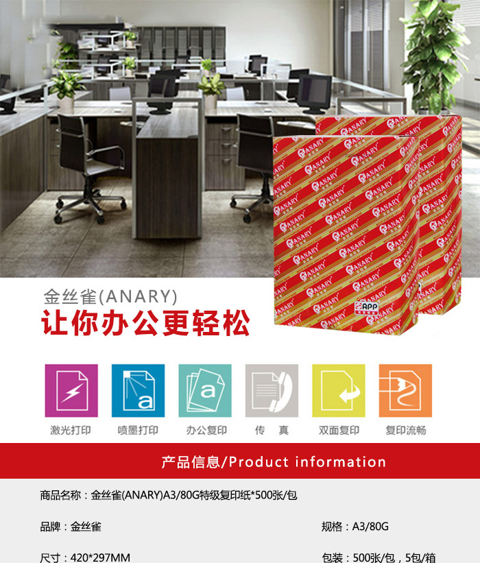 商品名稱:金絲雀(ANARY) 8K/80G 特級復(fù)印紙*500張/包*5包 白色